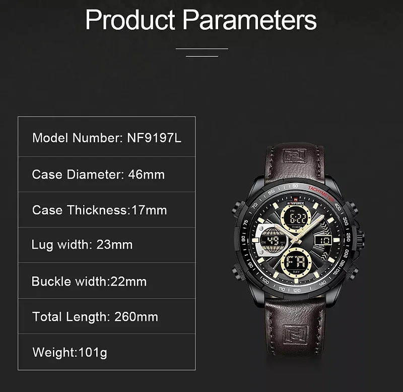 - Functional features; Dual time display, Alarm, stopwatch, complete calendar display and LED light for night vision.